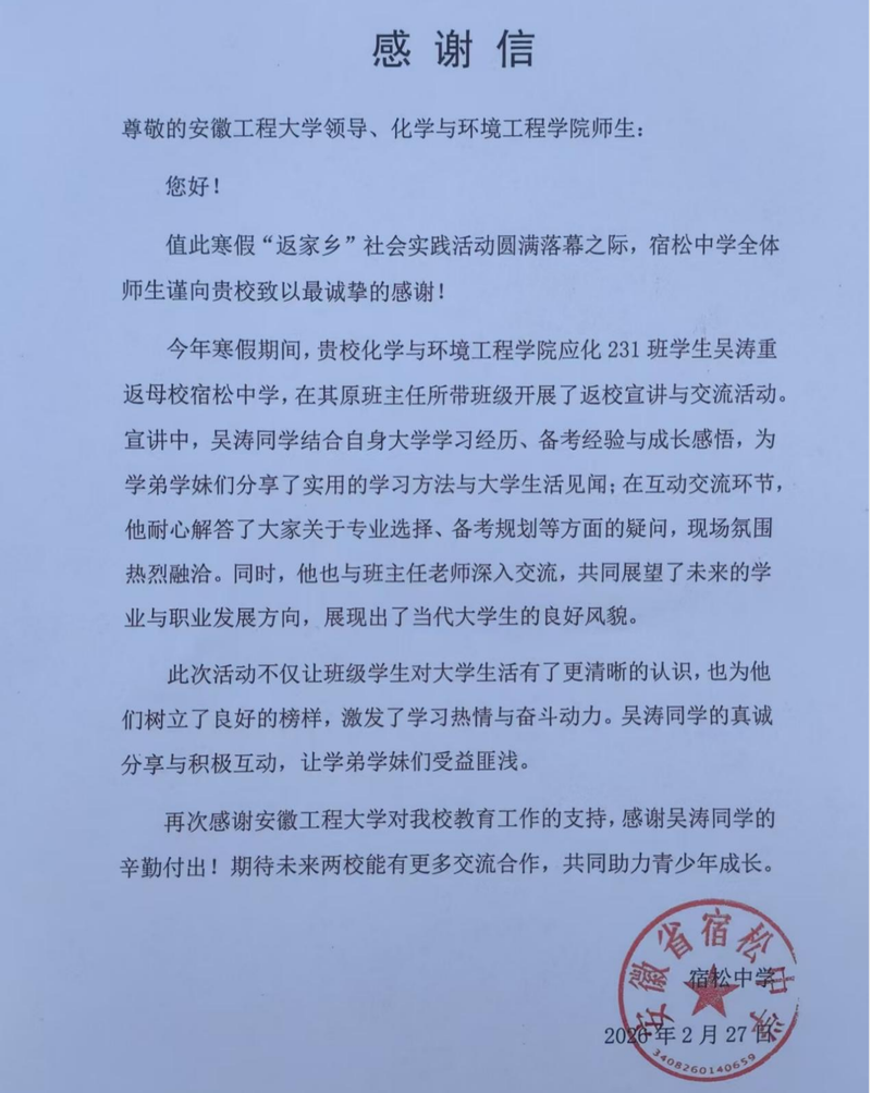 近日, 色色 获安徽省宿松中学感谢信,对学院学生应化231班吴涛在寒假期间重返母校开展“返家乡”社会实践暨返校宣讲活动给予高度评价。