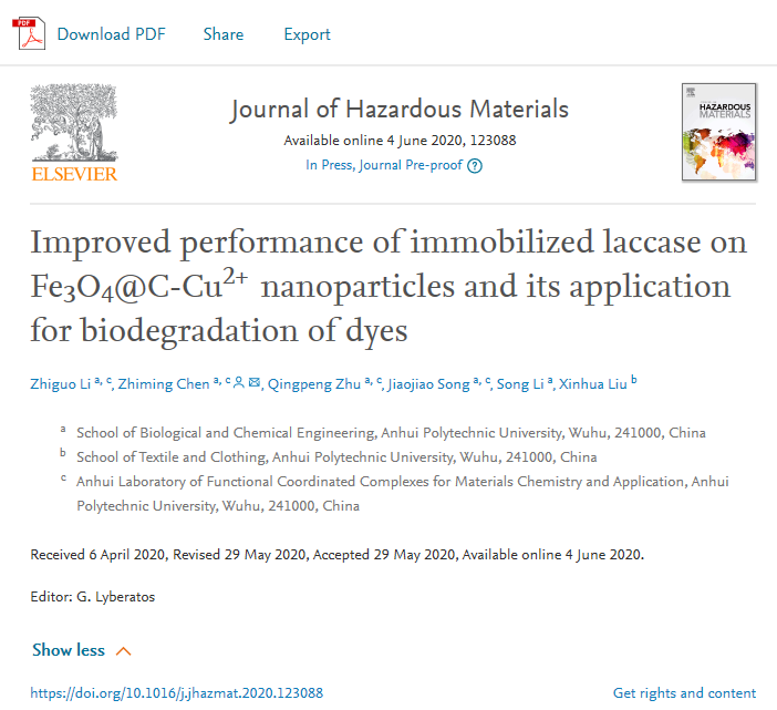 化环学院化学学科纳米生物催化作用团队经过长期攻关,最近在固定化酶研究领域取得重要进展,相关成果以“Improved performance of immobilized laccase on Fe3O4@C-Cu2+ nanoparticles and its application for biodegradation of dyes”为题在爱思唯尔(Elsevier)旗下期刊Journal of Hazardous Materials (IF:7.650,中科院一区)上在线发表(//doi.org/10.1016/j.jhazmat.2020.123088)。该论文第一作者为 色色 化学专业2018级硕士研究生李志国,通讯作者为 色色 陈志明教授。