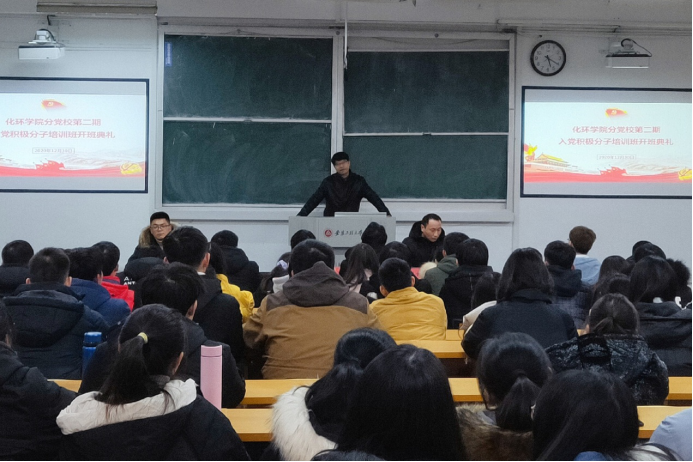 12月30日下午,化环学院分党校举行第二期入党积极分子培训班开班典礼。化环学院党委书记水心宝、党委副书记胡承功出席典礼,学院培训班共116位学员参加开班典礼,典礼由化环学院入党积极分子培训班班主任王康主持。