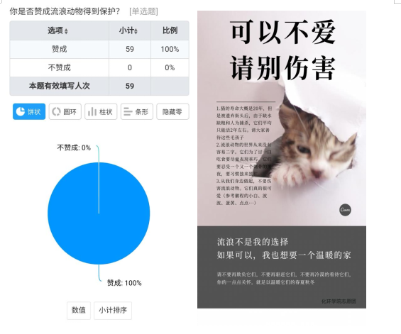 2021年5月,“格桑花”志愿服务团队在活动初期发布了线上问卷调查,并设计了关于“保护流浪动物”的海报。在活动中,团队通过分发海报以及宣传的方式呼吁同学们关爱保护流浪动物。