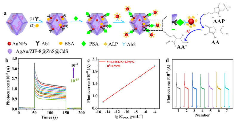 近年来金属有机框架(MOFs)材料以其比表面积大、可设计性强等特点而被广泛应用。该团队以MOFs为基本骨架,合成了一种新型plasmonic多层异质结(AgAu/ZIF-8@ZnS@CdS),并通过构建免疫生物传感器实现了对前列腺癌特异性抗原(PSA)的超灵敏检测,其检出限可低至0.9 fg·mL-1。该研究为MOF基光电免疫分析平台的构建提供了新思路和新方法。(论文DOI: 10.1016/j.cej.2021.133465)