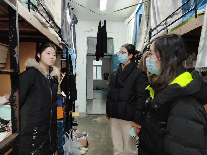各位老师检查了各个学生宿舍,做到了检查全覆盖,重点关注寝室拖线板乱插乱放、大功率电器违章电器使用、寝室“开火”等安全隐患,为同学们的寝室安全保驾护航并与同学们展开亲切交谈。各位老师嘱咐同学们,安全第一,预防为主,安全永远是我们精彩生活的前提和保障,要严格遵守学校宿舍安全管理制度,树立安全意识,共同建立一个安全卫生、文明有序的良好宿舍环境。另外提醒同学们遵守疫情防控要求,积极配合学校防疫工作,确保生命安全和身体健康;增强自我防范意识,谨防电信诈骗;鼓励学生走出宿舍,走向图书馆,走向体育场,加强体育锻炼;督促学生合理安排时间,抓紧复习,认真做好期末考试迎考准备。同时对即将走上考场的考研学子进行了慰问并祝愿他们考出理想的成绩。