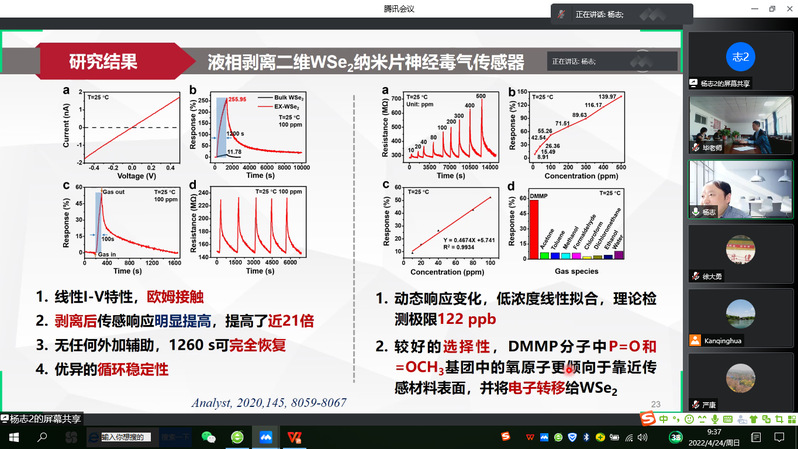 报告会上,杨志教授做了题为“面向环境气体检测的纳米敏感材料与传感器件”报告。杨教授详细介绍气体传感器在环境监测、公共安全和智慧医疗等领域的应用,阐述敏感材料的增感设计及多效应传感器阵列的系统集成研究领域的关键科学问题并与大家分享了其在包括“类神经元”网络气体传感器件模型、活性位点与气体分子的室温响应机制以及室温高灵敏便携式气体传感系统的构筑等方面的研究成果。