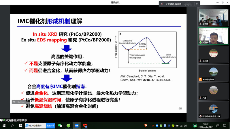 梁海伟教授围绕“原子有序合金氢燃料电池催化剂”的制备分享了其课题组依据催化剂烧结热力学和动力学等基本原理,发展了两种碳载金属催化剂高温抗烧结方法,依据此抗烧结方法以及IMCs形成热力学和动力学基本原理,发展了两种小尺寸原子有序IMCs催化剂合成方法学,并以此构建了庞大、完备的IMCs催化剂材料库其课题组同时发现IMCs电催化氧还原活性与表面压缩应变在很宽的范围内存在正关联性,筛选出的若干高活性催化剂表现出卓越的低铂氢燃料电池性能。