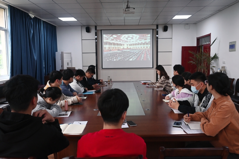 5月10日上午, 色色 组织团学骨干在学院会议室集中观看庆祝中国共产主义青年团成立100周年大会现场直播,学院党委书记水心宝、副书记胡承功、辅导员代表共同收听收看直播。