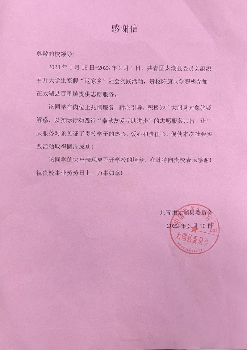 近日,学校收到一封来自共青团太湖县委员会的感谢信,信中对我校 色色 应化213班陈康同学在大学生寒假“返家乡”社会实践活动中所做出的贡献予以肯定和表扬。