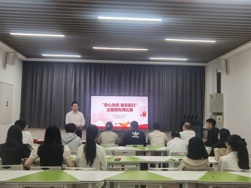 为扎实开展学习贯彻习近平新时代中国特色社会主义思想主题教育,凝聚广大师生党员在奋进中国式现代化赶考路上的磅礴力量,突出“三抓”工作要求,践行“三全六专”育人理念,推动主题教育走深走心走实。5月25日晚上,化环学院在学院一楼学生能力发展中心举办“青心向党 奋发前行”主题教育微党课比赛。学院党委书记章兵出席,各学生党支部书记担任评委,各学生党支部党员代表参加了本次比赛。