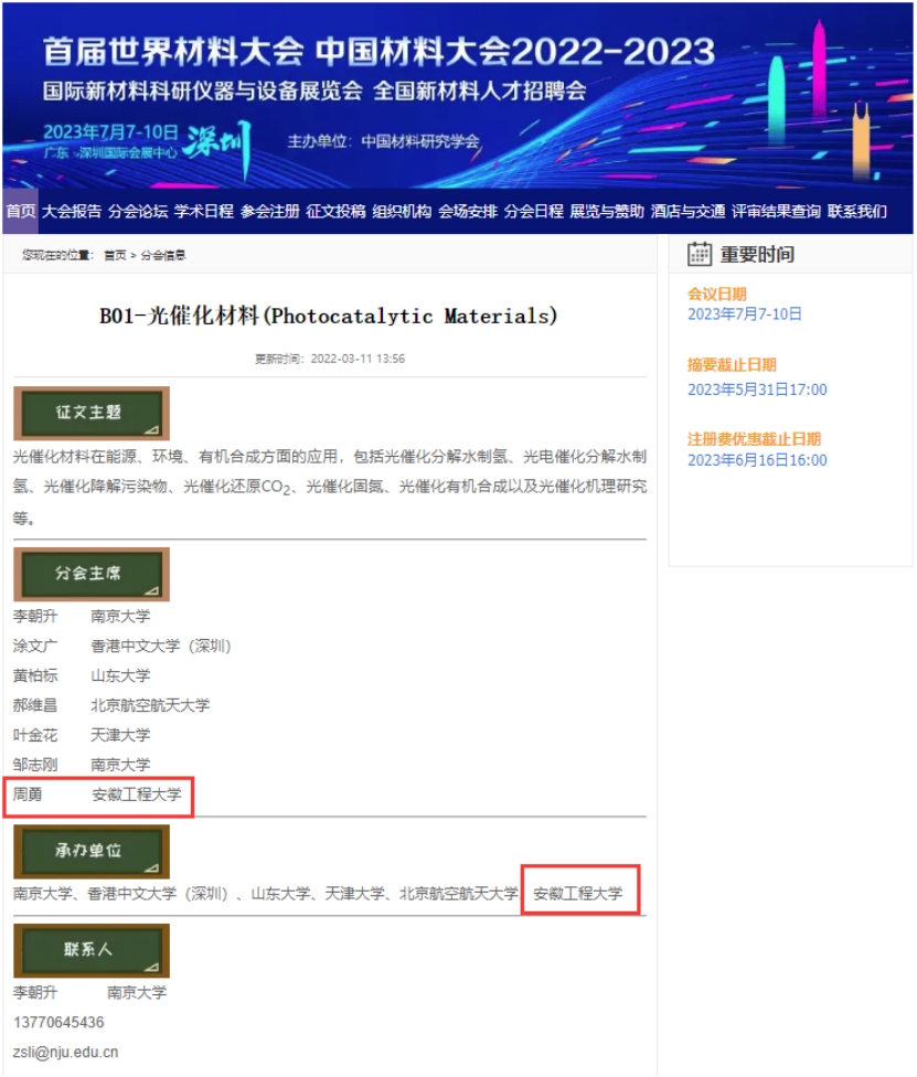 本届中国材料大会聚焦前沿新材料科学与技术,设置77个关键战略材料及相关领域分会场,1.9万余名材料科技工作者和企业代表、1500余位杰青长江学者、50余位两院院士出席了本次大会。我校 色色 周勇教授担任光催化材料分会主席之一。光催化材料分会汇聚来自全国各地100多位相关领域的专家学者和行业人士,共同探讨光催化材料在太阳能水分解制氢、二氧化碳转化和环境净化等方面的最新研究进展和创新应用。周勇教授做了题为“原子层厚光催化材料表面缺陷构筑促进二氧化碳C-C偶联”邀请报告。蒯龙博士做了题为“单原子负载介孔金属氧化物的制备及应用”的口头报告。色色 此次成功作为承办光催化材料分会单位之一,是对我校宣传的一次很好契机,提升了我校在国内学术交流方面的影响力。