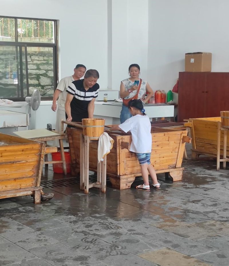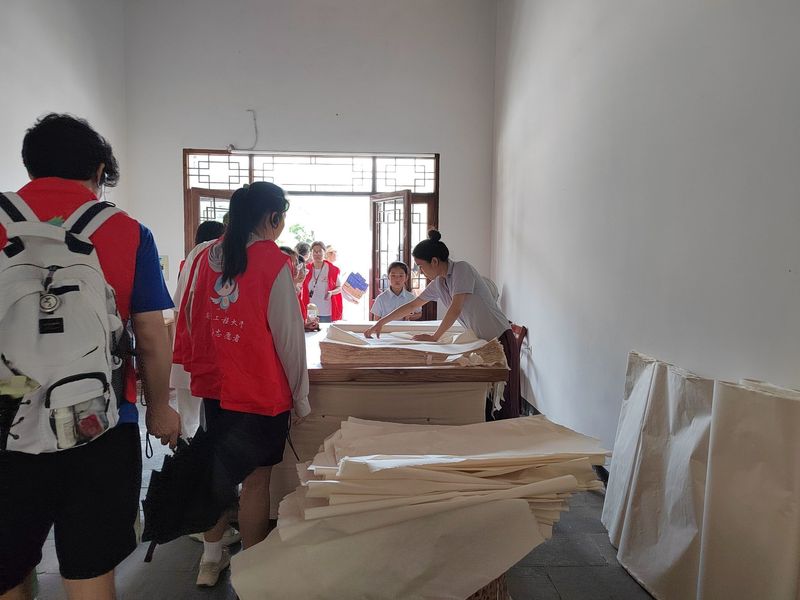 为了能够更直观的了解宣纸的制作工艺流程,实践队伍前往“三丈三超级宣纸制作工坊”进行调研。在调研的过程中,志愿者们认真观察“温水浸泡,晾晒,熬汁,漂洗,烘干,修整”的制造工序,领悟到了中共二十大代表、大国工匠、毛胜利先生所说的“晒好每一张宣纸,弘扬工匠精神,为我国文化事业作出自己的贡献。”