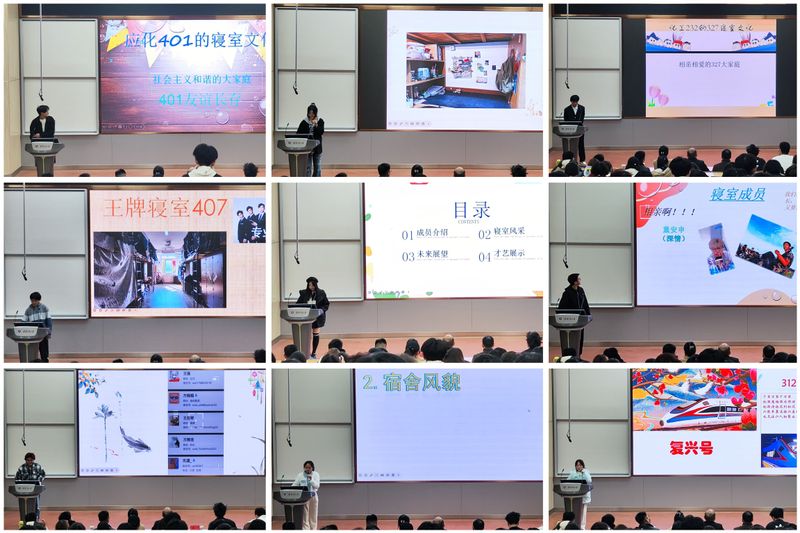 本次寝室文化大赛分为寝室卫生评比、寝室特色PPT及宿舍集体才艺展示视频制作三个比拼部分。经过前期激烈的角逐,10个寝室成功突围进入决赛。各寝室代表人员结合PPT详细展示了寝室风采,介绍了寝室成员,展望了未来规划,并通过视频的形式进行了才艺展示,从不同的方面展现了大学生青春洋溢,满怀热情的精神面貌。各寝室还展示了浓厚的学习氛围和整洁的寝室环境。