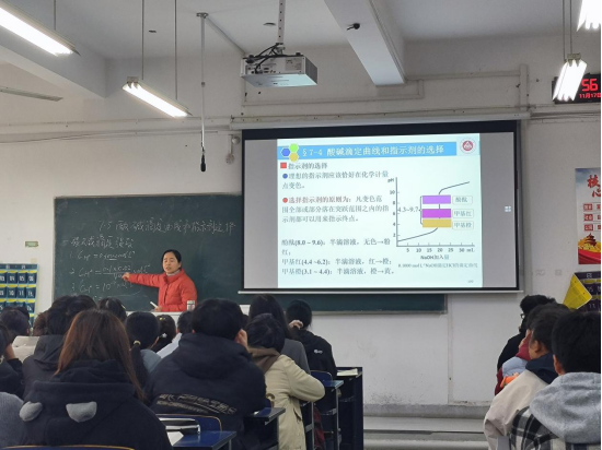 本次观摩课程为王芬华老师讲授的《无机及分析化学Ⅱ》第七章酸碱平衡法与酸碱滴定法,具体内容为“酸碱滴定曲线和指示剂定律”。王教授通过课前提醒学生网络签到把控上课人数,引导学生回顾复习上节课所授内容,授课过程中,利用雨课堂进行线上线下混合式教学,板书与PPT内容相结合,以案例分析细化知识点强化学生理解,课堂中有目的的提问更好的与学生互动,启发学生思考,调动学生学习积极性,让学生充分参与,主动求知,教学效果良好。