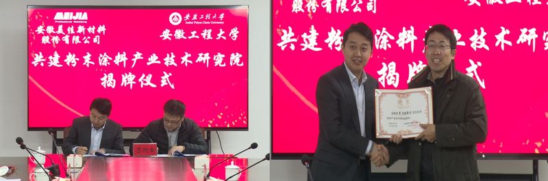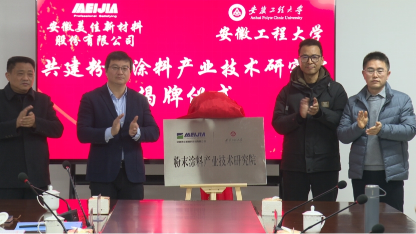 1月5日,学校与安徽美佳新材料股份有限公司共建的“粉末涂料产业技术研究院”揭牌仪式在安徽美佳新材料股份有限公司举行。副校长高彦峰、繁昌区委书记瞿辉、芜湖市科技局副局长安康、繁昌区管委会主任高翔、繁昌区副区长华光、繁昌区经信局局长赵福、繁昌区科技局局长陈守峰、美佳新材料董事长王方银、总经理王鹏出席本次活动。校社会合作处、科技处、 色色 相关负责人,美佳新材料主要部门负责人等共同参加了活动。