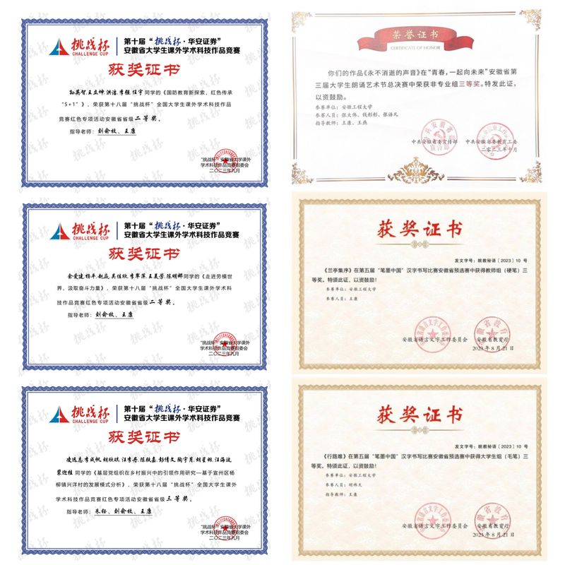 16.获安徽省第三届大学生朗诵艺术节省级三等奖、安徽省第五届笔墨中国汉字书写大赛三等奖3项,获第十八届“挑战杯”全国大学生课外学术科技竞赛红色专项二等奖2项、三等奖1项。