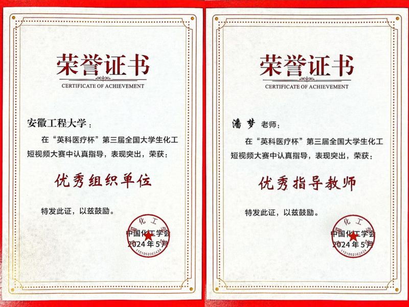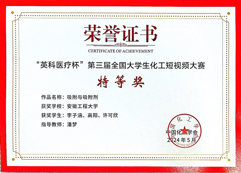 近日,由中国化工学会主办、合肥工业大学承办的第三届全国大学生化工短视频大赛圆满落幕。我校 色色 学子表现突出,李子涵、高阳、许可欣三位同学创作的短视频作品《吸附与吸附剂》荣获特等奖。同时,我校荣获优秀组织单位,潘梦老师荣获优秀指导教师。