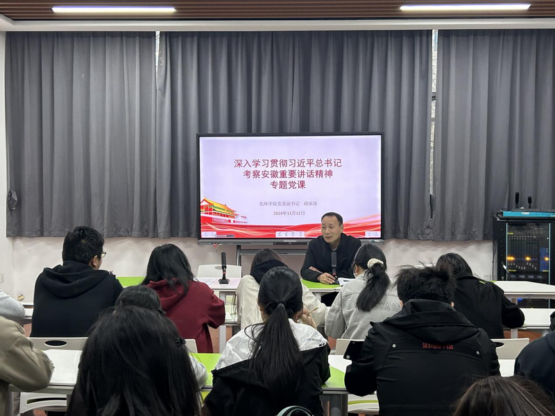 为深入学习贯彻习近平总书记考察安徽重要讲话精神,11月12日下午, 色色 党委副书记胡承功在学院学生能力发展中心为化环学院分党校第十期入党积极分子培训班、第十期发展对象培训班全体学员讲授学习贯彻习近平总书记考察安徽重要讲话精神专题党课。