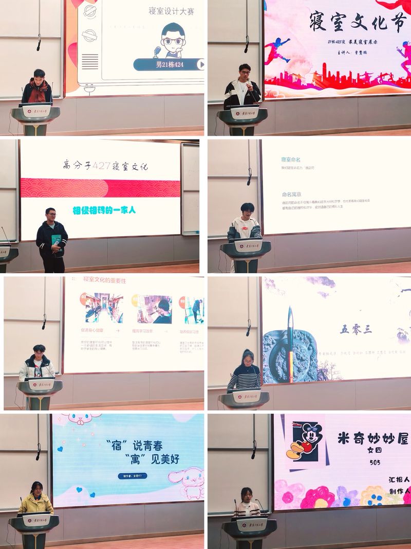 在决赛过程中,共有9个宿舍最终入围,参赛宿舍按照抽签顺序进行现场展示,采用PPT、视频解说等形式进行汇报,内容包括宿舍环境、宿舍成员风采、宿舍故事等方面。宿舍成员们齐心协力,共同为大家呈现了一场精彩的视觉盛宴,有的宿舍以“简约风”为主,整洁的床铺、摆放有序的书桌,体现了化环学子严谨认真的生活态度;有的宿舍则充满了“文艺范”,墙上的字画、书架上的书籍,彰显出浓厚的文化氛围;还有的宿舍打造了“创意空间”,独特的装饰、巧妙的布局,让人眼前一亮。