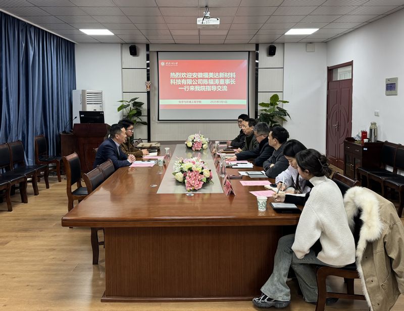 王宗乾对陈福涛一行的到来表示热烈欢迎,对安徽福美达新材料科技有限公司长期以来对学校事业发展的关心和支持表示感谢。他围绕学校师资队伍、学科布局、人才培养、优势科研平台等进行了简要介绍。他强调,学校长期以来高度重视校企合作,学校鼓励引导专业教师走进企业,去解决企业实质性问题,齐力促进科技成果转化落地。他表示,双方拥有良好的合作基础,希望以此为契机,共同探索多样化的合作机制,优势互补、协同发展,实现互利共赢,推动企业和学校在技术攻关、成果转化、产业发展等方面继续开展深度合作。