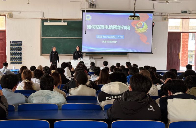 为切实增强学生防范电信网络诈骗的意识,提升校园安全水平,化环学院联合校安全管理处于4月2日下午在6教215举办了以“防诈反诈 安全同行”为主题的防诈骗安全教育专题讲座。本次讲座特邀芜湖市公安局鸠江分局鸠盾·巾帼反诈队队长姚璐璐警官,芜湖市公安局鸠江分局鸠盾·巾帼反诈队王云杉警官主讲,校安全管理处相关人员、学院辅导员以及各班级本科生代表参加了此次讲座。