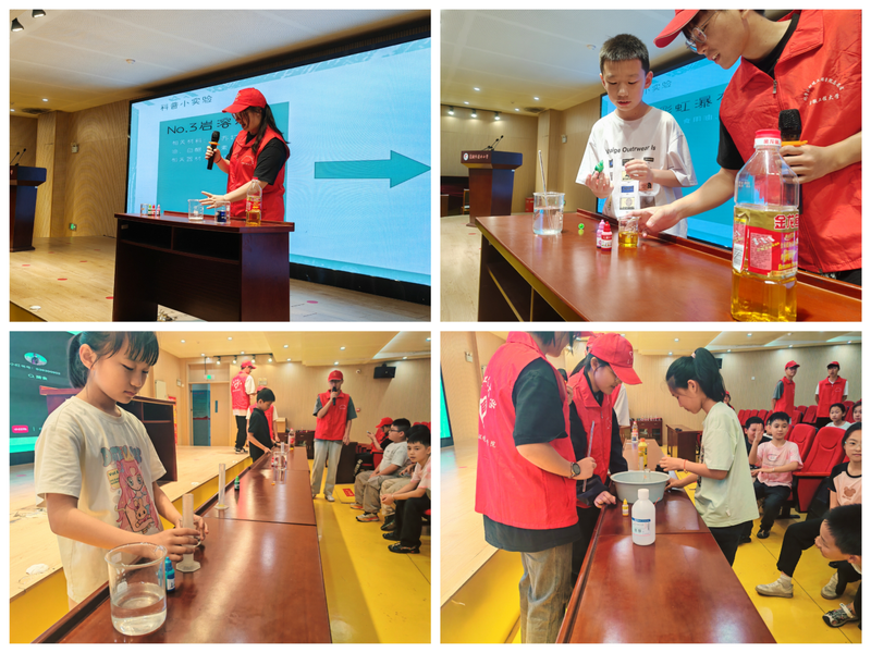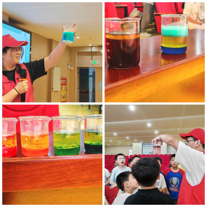 活动在充分保障试剂使用安全的情况下,设计了一系列吸引青少年群体参与的互动环节,旨在通过实践操作,让孩子们寓教于乐,体验化学的魅力所在。化学工程专业学生党支部成员轮番上阵,带领小朋友们参与了“大象牙膏”、“彩虹瀑布”、“岩溶灯”、“火山喷发”等四组风格迥异的化学实验。