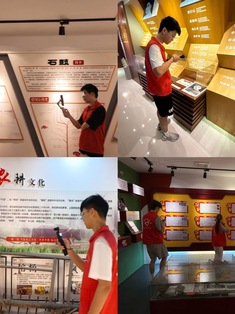 带着对革命先烈的崇敬,团队冒雨转战石鼓村村史馆。与纪念馆的肃穆不同,村史馆充满了浓郁的乡土气息与时代活力。镜头在老式农具、斑驳粮票、精巧手工艺品与现代乡村规划图、产业发展数据间切换。新旧对比强烈,一幅石鼓村从贫困落后迈向宜居宜业、拥抱数字经济的生动图景在团队的镜头下徐徐展开。