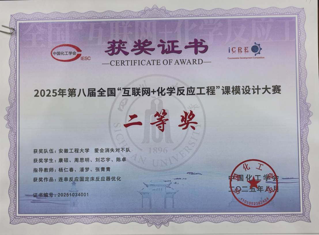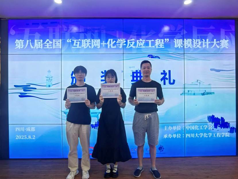 由中国化工学会主办,四川大学承办的第八届全国“互联网+化学反应工程”课模设计大赛于2025年8月2日在四川大学展开。我校首次组队参加该赛事,经过激烈角逐,我校设计提交的《连串反应固定床反应器优化》作品荣获国家级二等奖(指导老师为杨仁春、潘梦、张青青)。