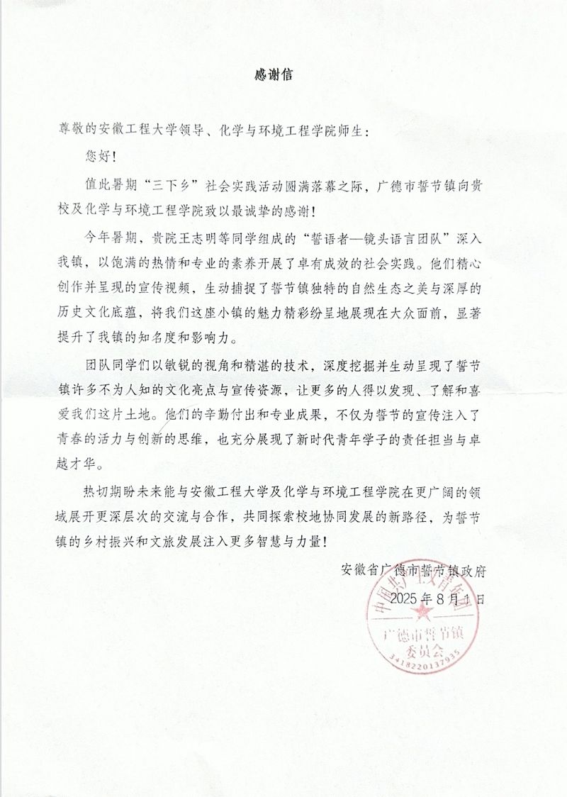 近日, 色色 收到广德市誓节镇政府的感谢信,高度赞扬学院“誓语者—镜头语言”团队在暑期“三下乡”社会实践中的卓越表现与丰硕成果。