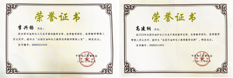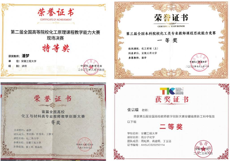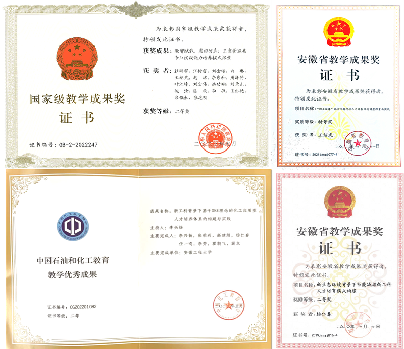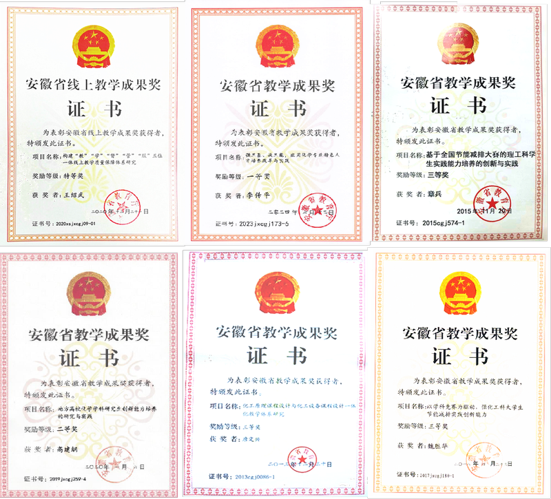 教学成果颇丰。获得国家级教学成果二等奖1项,安徽省特等奖学金2项,一等奖1项,二等奖2项,三等奖5项,中国石油和化工教育教学优秀成果二等奖1项。