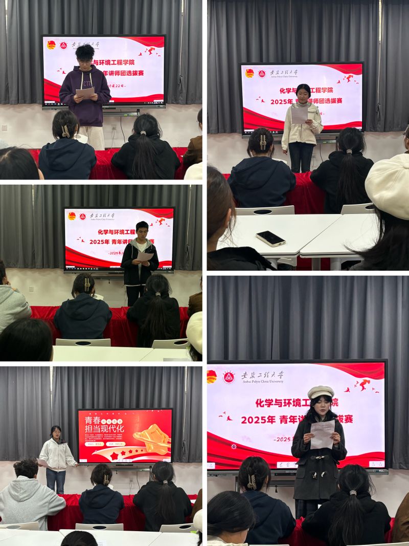 比赛现场,来自各专业的优秀团员以“讲好校史故事、践行青年担当”为主线,带来了一场兼具思想深度与情感温度的宣讲盛宴。各共青团员的宣讲主题多元且深刻。有的以理论学习为基础,解读中国式现代化的内涵,并结合校园志愿服务经历,讲述如何用点滴行动服务社区、传递温暖;有的结合马克思主义理论学习,解读中国式现代化的科学内涵。每一段宣讲都饱含真情,生动诠释了新时代大学生如何以理论为基、以实践为笔,在科技创新、乡村振兴、志愿服务等领域书写青春答卷,充分展现了化环学子“挺膺担当”的精神风貌。