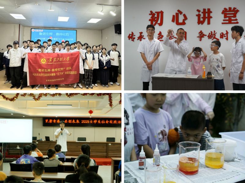“鲁诺生辉,桑梓化钧”团队化身“科普轻骑兵”走进明光市第三中学,以趣味实践拆解化学密码,激活高中生科学基因;化工支部党员在芜湖市清水小学开展墨染乡韵,“化”启新章,化学科普实验行实践;“童享化学,七彩领航”乡村振兴实践营走近宣城广德市桐汭街道开展“化学与医药大思政课”为主题的特色课程,将科学知识与家国情怀巧妙融合,为参与活动的孩子们带来了一堂妙趣横生的成长课;燃梦“化”语社会实践团队走进芜湖天门山街道广福社区,与青少年共赴趣味化学实验之约,点燃科学好奇心。
