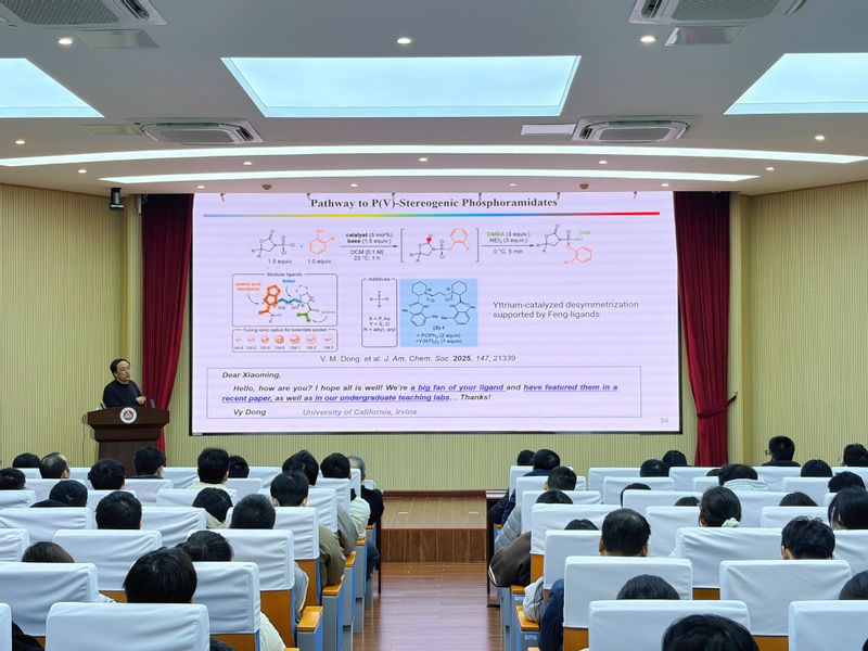 报告中,冯小明院士讲述了新型优势手性催化剂的研究背景及意义,重点介绍了其课题组设计合成的一类具有含双氮氧配体的新型优势手性催化剂及其在多种典型有机反应中的普适性,展示了该类型新型优势手性催化剂在国际有机化学领域的重要影响,包括创造的第一个以中国本土研究工作命名的有机人名反应—“Roskamp-Feng”反应,以及面向全球销售的“冯氏配体”。报告中,冯院士系统介绍了实验室创制的手性催化剂在重氮化学反应、光催化反应、自由基反应、双金属接力催化以及天然产物和药物合成中的应用,展示了其广阔的应用前景。