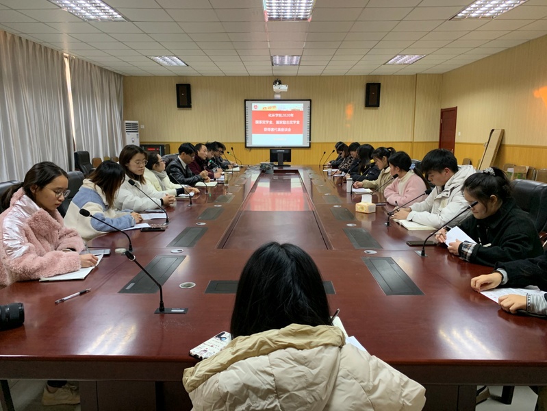 2020年12月4日下午, 色色 召开2020年国家奖学金、国家励志奖学金获奖者代表座谈会。来自全院各个年级和专业的获奖者代表共14名同学参加座谈会,学院党委书记水心宝、党委副书记胡承功以及院团委书记和全体辅导员老师参加会议。会议由胡承功主持。